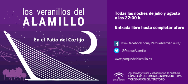 El Parque del Alamillo ha organizado un año más sus ya tradicionales Veranillos del Alamillo, con un amplio programa de actividades que cada noche de julio y agosto llenarán el recinto de música, cine, magia, flamenco y talleres. El programa lo ha preparado el propio parque, que está gestionado por la Consejería de Fomento, Infraestructuras y Ordenación del Territorio a través de la Agencia de Vivienda y Rehabilitación de Andalucía (AVRA), con la colaboración de entidades como la Asociación de Amigos del Alamillo, la Fundación Cristina Heeren y las asociaciones Sones de Andalucía, Ramillete de Arte y Aires de Copla.