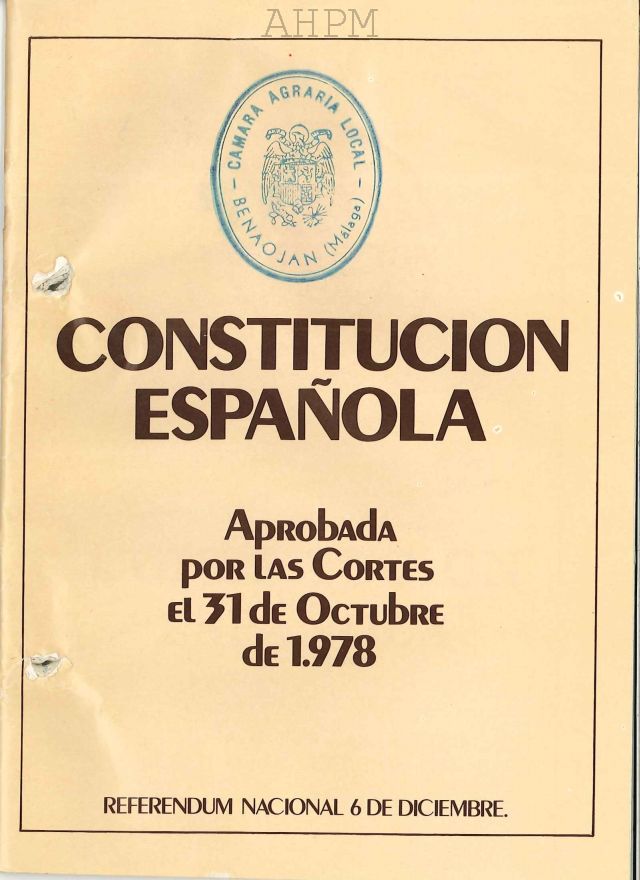 Constitución Española. Aprobada por las Cortes el 31 de octubre de 1978. Observaciones: El servicio de Correos distribuyó unos 20 millones de folletos como éste las semanas previas a la jornada electoral. Folleto. 1978, Madrid. Sección Cámaras Agrarias. Signatura: 70447.