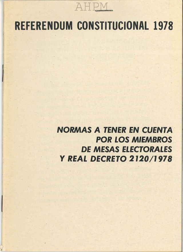 Normas a tener en cuenta por los miembros de mesas electorales y Real Decreto 2100/1978, de 25 de agosto, por el que se establecen normas para la celebración de consulta directa a la Nación por medio del Referéndum. (Boletín Oficial del Estado, núm 219. 23-sep-1978). Madrid: Hauser y Menet, 1978. Folleto. 1978, septiembre. Madrid. Sección Gobierno Civil. Signatura: 12900/1.