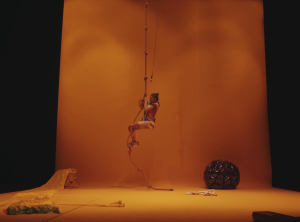 La mujer dialoga con los distintos elementos que el espacio le aporta: una cuerda de 9 metros, una pelota gigante, la cinta de correr, un dance-air con el que lidia una batalla a vida o muerte. La descripción textual se abraza al detalle corporal. Una actriz que se mueve como toro en su redil, como niño en un parque de bolas, como una pelea de guerrilleros en la selva tropical. En definitiva, un mano a mano entre palabra y movimiento llevado al humor y el pensamiento.