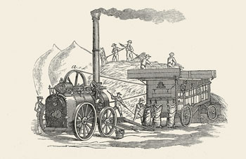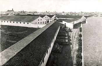 Trilladora mecánica con locomóvil de vapor, en una ilustración de la revista La España Agrícola de la década de 1860, y panorama de bodegas de Jerez de la Frontera, en foto de J. Laurent, hacia 1880. La agricultura es un sector clave en la economía de Andalucía del XIX, que en 1890 todavía comprende el 68,5% de la población activa y aporta el 35,4% del PIB regional. En esta centuria experimenta una expansión considerable, con el incremento de las superficies de cultivo e incipientes medidas de modernización en sus comarcas más productivas, que contrastan con el atraso en amplias zonas, haciéndola muy vulnerable a las crisis agrarias que se desatan a fines del siglo. A la cabeza de su aportación destacan las producciones comerciales de vino, aceite, uva y frutas de las provincias de Cádiz, Málaga, Almería, Sevilla y Córdoba, que, no obstante, se verán aquejadas por una sucesión de crisis desde el último tercio del siglo XIX.