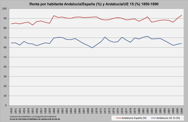 Respecto a la referencia del conjunto nacional, la posición andaluza sufre un continuo pero relativamente moderado deterioro a lo largo del siglo, y ello partiendo de una posición privilegiada a comienzos del siglo como herencia del Antiguo Régimen. Tras unos impulsos iniciales basados en el sector minero metalúrgico y la dinámica industrial de algunas ciudades como Sevilla, Cádiz o, sobre todo, Málaga, los niveles de renta regional se estabilizan entorno al 90% de la media nacional.