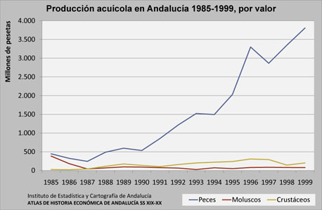 Descarga tablaLa acuicultura se ha presentado como alternativa a la crisis del sector pesquero andaluz, aún así su producción a finales de siglo era sólo el 4% de la pesca desembarcada.
