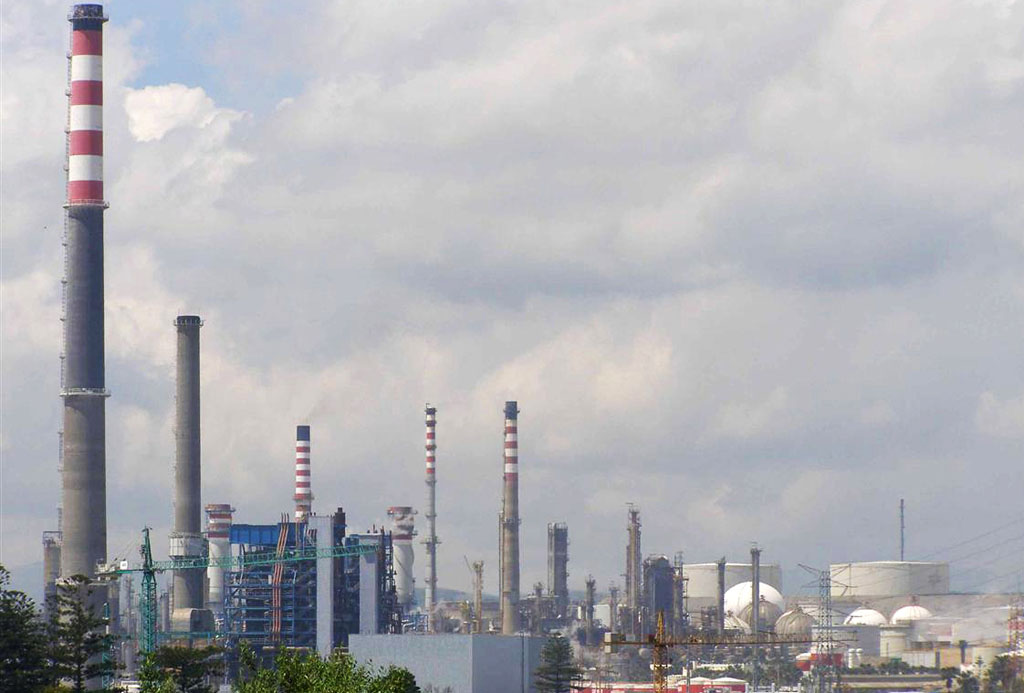 Vista del área de Puntales de Cádiz con los antiguos depósitos de hidrocarburos y la central térmica terminada en 1956, junto a la gran torre, de 156 m de altura, para el tendido de cables de conducción eléctrica hasta Puerto Real, en una imagen de finales de la década de 1980. A la derecha, refinería Gibraltar-San Roque en la Bahía de Algeciras, una de las dos grandes instalaciones de esta clase existentes en Andalucía.