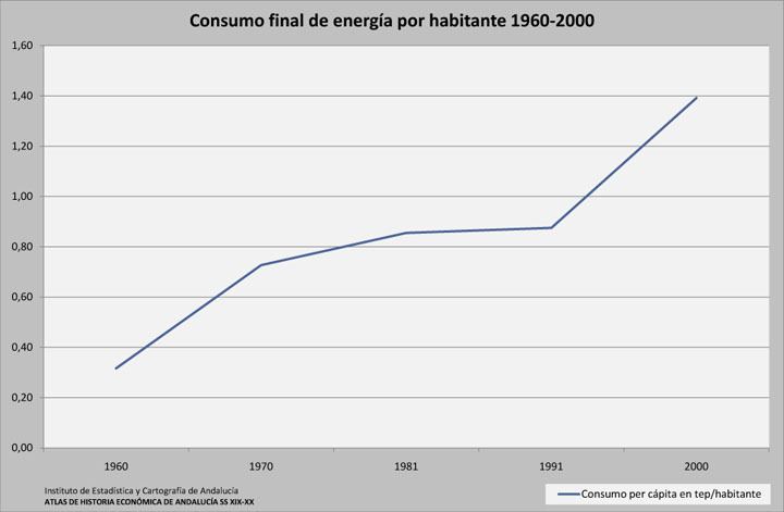 El consumo crece con una tendencia sostenida, a la vez que se produce una redistribución intersectorial del mismo, acorde a la evolución de la estructura económica. El sector primario pierde cuota, aunque en términos absolutos crece su consumo energético, como todos los demás; cuota que ganan, sobre todo, el sector terciario y el doméstico. Y más llamativa aún es la evolución respecto a tipos de energías consumidas finalmente: los derivados del petróleo y la electricidad se imponen, a la vez que el carbón casi desaparece y despuntan nuevas formas en las últimas décadas del siglo XX, sobre todo gas natural y las energías renovables.