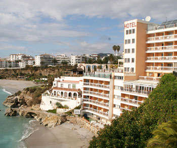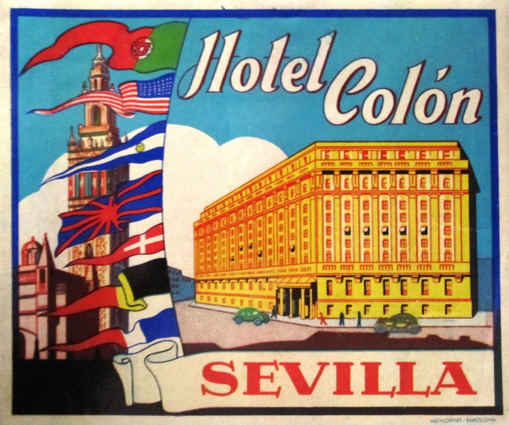 Etiqueta de un hotel clásico de Sevilla y hotel ante una cala de Nerja en la Costa del Sol de Málaga. Al iniciarse el “boom” turístico de Andalucía a mediados del siglo XX aún prevalece la distribución de la oferta hotelera heredada de las décadas anteriores, con Sevilla, Granada, Cádiz y otras ciudades a la cabeza en cuanto a número de establecimientos y plazas disponibles. El panorama cambia por completo en pocos años y Málaga, la Costa del Sol, se adelanta desde entonces con gran ventaja.