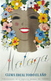 Cuatro imágenes representativas de la trayectoria del turismo en Málaga y su Costa del Sol, desde las incipientes iniciativas de la primera mitad del XX, a su desarrollo desde mediados del siglo: publicación del Patronato Nacional del Turismo de 1928 y cartel de la Dirección General del Turismo de la década de 1940, firmado por Teodoro Delgado, en los que se subrayan las privilegiadas condiciones climáticas de Málaga como atractivo para los visitantes; a la derecha, etiqueta de un hotel de la Costa del Sol, en Marbella, de la década de 1960, y edición promocional de los años ochenta de Benalmádena, en la que se ilustran sus alicientes como “lugar de descanso” y “centro de diversión” con playas, campos de golf, puerto deportivo, rincones típicos y diversos establecimientos de ocio.