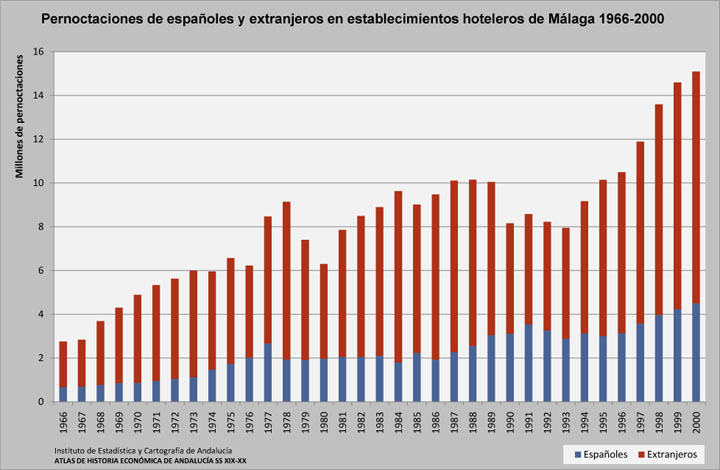 Como ha resaltado en sus estudios C. Pellejero, los datos referentes al fenómeno turístico para la provincia en el año 2000 reflejan su espectacular desarrollo en apenas medio siglo: Málaga recibe ocho millones de visitantes, el 59% procedentes del extranjero, cuenta con más de cien mil plazas de alojamientos y suma quince millones de pernoctaciones en sus establecimientos hoteleros, registro que la situaba como cuarto destino español en este apartado, con un 6,6% del cómputo nacional; por otra parte, sólo los ramos específicos de su sector turístico emplearon a más de 60.000 personas (cerca de 13% de la población activa provincial) y su valor añadido bruto representó algo más del 26% del PIB malagueño entre producción directa e inducida.