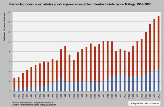 Descarga mapa Descarga tablaEl número de pernoctaciones por provincia en el último tercio del siglo XX ponen de manifiesto el fuerte ascenso del turismo en Málaga, en la que se contabilizan algo menos de tres millones en 1966 y más de quince en el año 2000, con una trayectoria general de subida punteada con algunos retrocesos, durante las crisis de los años setenta y más acusados a principios de los noventa, que obligaron a una renovación y mejora de la oferta del sector. En comparación con las demás provincias andaluzas, los datos de Málaga reflejan su avanzada y distanciada posición, superando con amplitud los máximos de aquéllas que arrojan cantidades más altas, como Cádiz, Almería o Sevilla, pero en todo caso apenas superiores, en ocasiones, a los cuatro millones de pernoctaciones o el 15% del total en Andalucía.