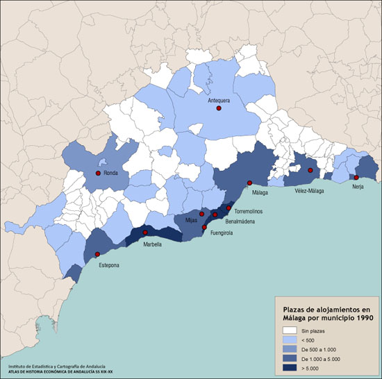 El protagonismo que ha adquirido la “industria turística” en el conjunto de Andalucía encuentra su manifestación más rotunda en la provincia de Málaga, y en concreto en su franja litoral, en la que ha arraigado la denominación de Costa del Sol. Con el antecedente de varias iniciativas que desde la últimas décadas del XIX trataron de fomentar el papel de Málaga como estación de invierno, desde mediados del XX su fachada costera comienza a situarse a la cabeza del turismo en la región, caracterizado ahora por el aprovechamiento prioritario de los recursos de sol y playa, y por tanto, con una estacionalidad ante todo veraniega, y la afluencia masiva de visitantes, con un apreciable componente internacional.