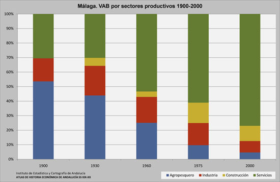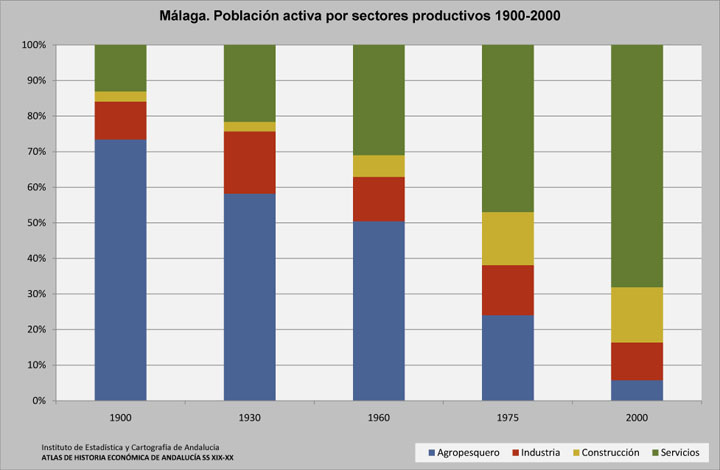 Descarga tablaEl auge del turismo es el factor determinante del cambio estructural y la acusada terciarización de la economía de Málaga desde mediados del siglo XX, de modo que para el año 2000 los servicios, junto con la construcción, suponen el 87,5% del valor añadido bruto del producto interior de la provincia y casi el 80% del empleo de la población activa. Una situación que se precipita a raíz de la profundización del fenómeno turístico desde principios de los años sesenta, cuando el sector agropesquero todavía comprende, por ejemplo, más del 50% de la población activa. Atrás queda el rumbo industrial que tomó Málaga durante siglo XIX y que de manera precaria se mantuvo hasta el primer tercio del XX, truncado desde los años treinta, y con un efímero repunte durante el desarrollismo franquista que finalmente se vería reducido a una mínima aportación.