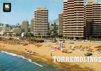 Postales con una imagen de Puerto Banús (Marbella) en fechas cercanas a su inauguración en 1970 y de la urbanización Playamar de Torremolinos. Marbella y Torremolinos son los dos principales polos históricos del turismo de la Costa del Sol. Además de haber experimentado un rápido crecimiento demográfico (a comienzos del siglo XXI Marbella rebasaba los 100.000 habitantes y Torremolinos rozaba los 45.000), son las poblaciones malagueñas que concentran mayor número de alojamientos. En su masiva afluencia de visitantes extranjeros ha sido decisiva, al igual que para el conjunto de la Costa del Sol, la cercanía y adaptación a las necesidades del aeropuerto de Málaga, el de mayor tráfico de Andalucía y uno de los primeros de España, con una cifra de viajeros internacionales en vertiginoso aumento que ha pasado de unos 270.000 en 1965 a más de siete millones en el año 2000.
