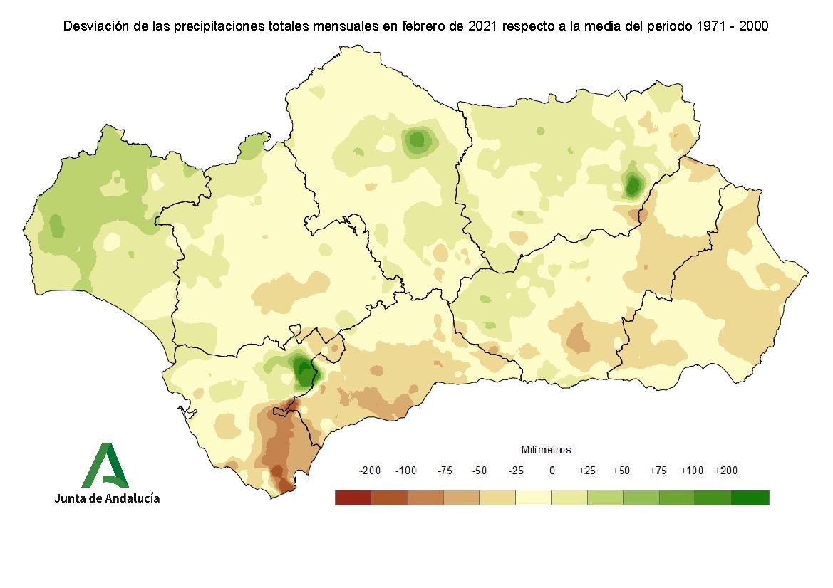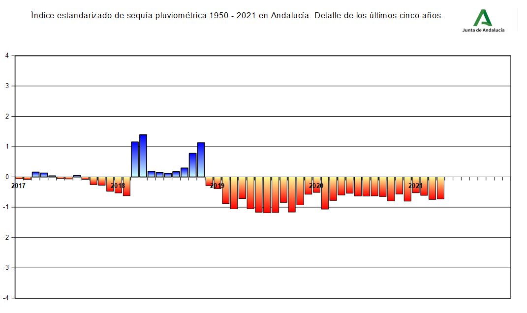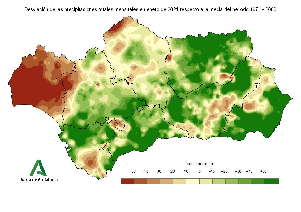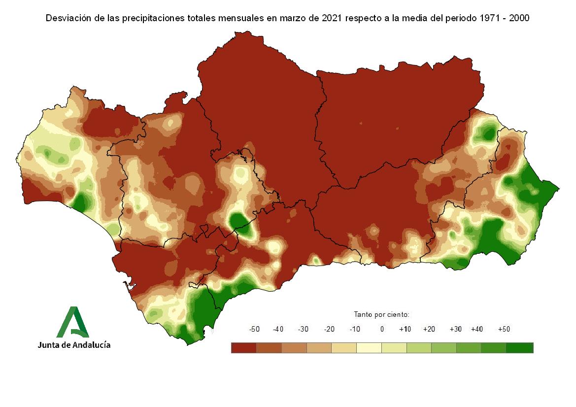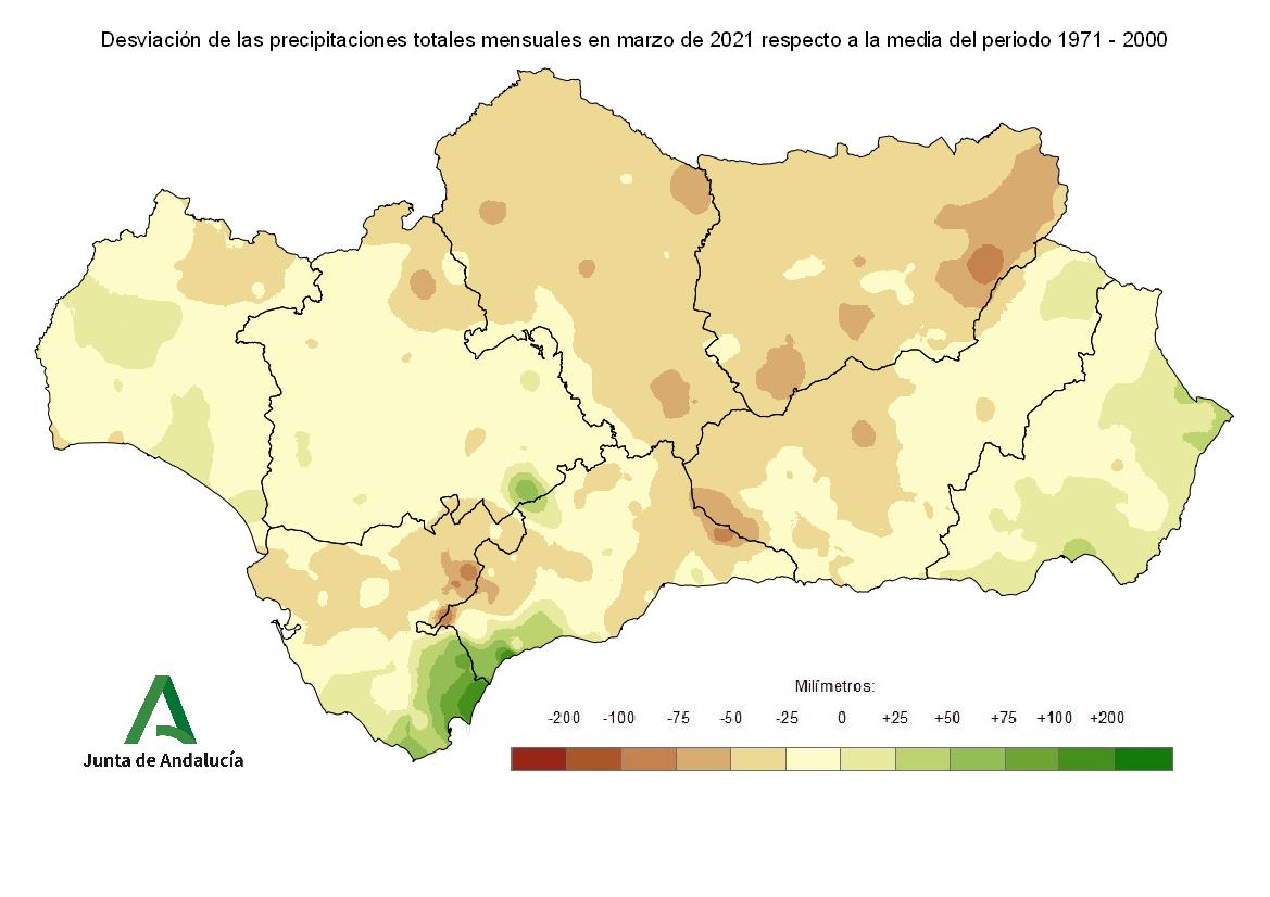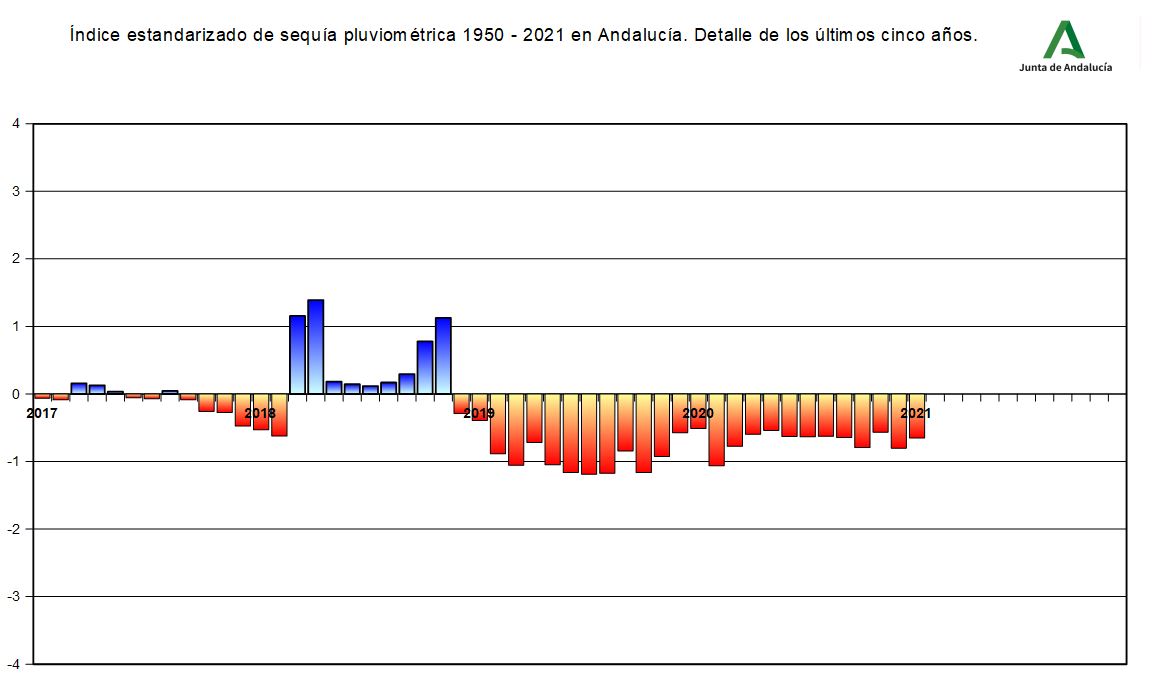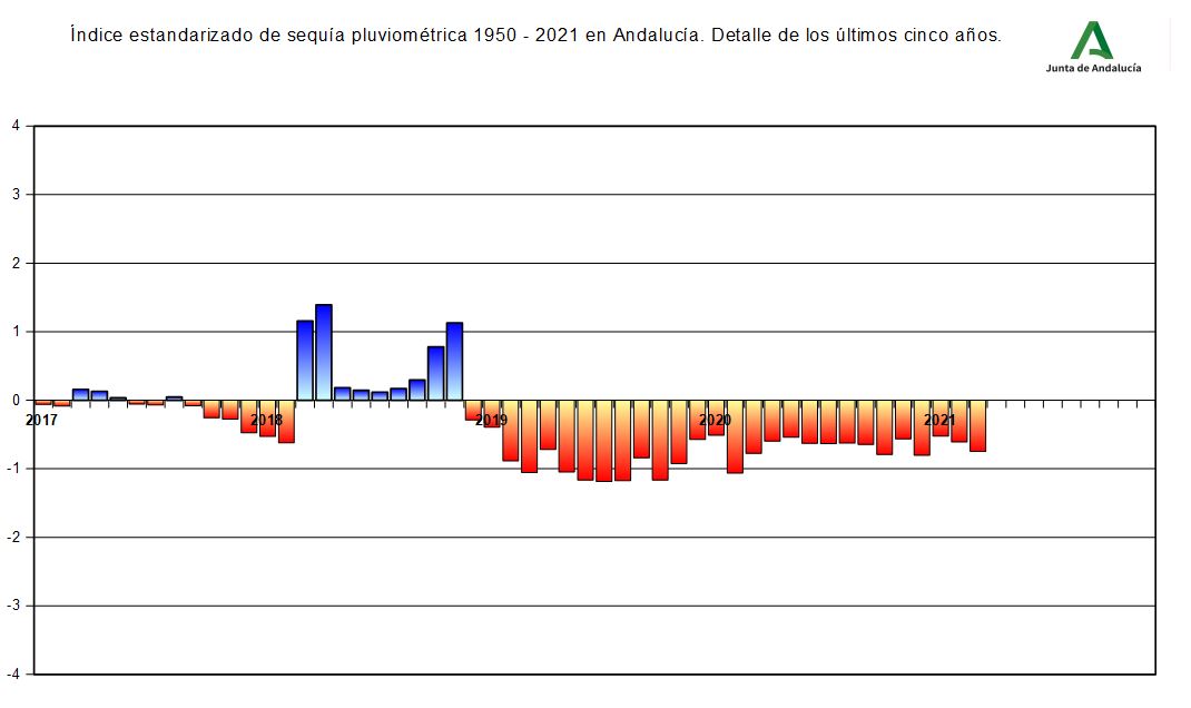 Datos climáticos mensuales sobre precipitación, temperatura y sequía en Andalucía, durante 2021