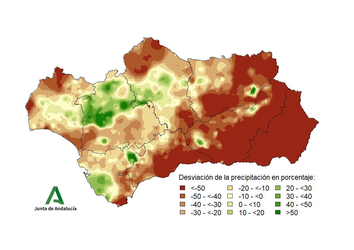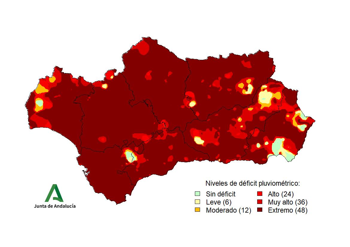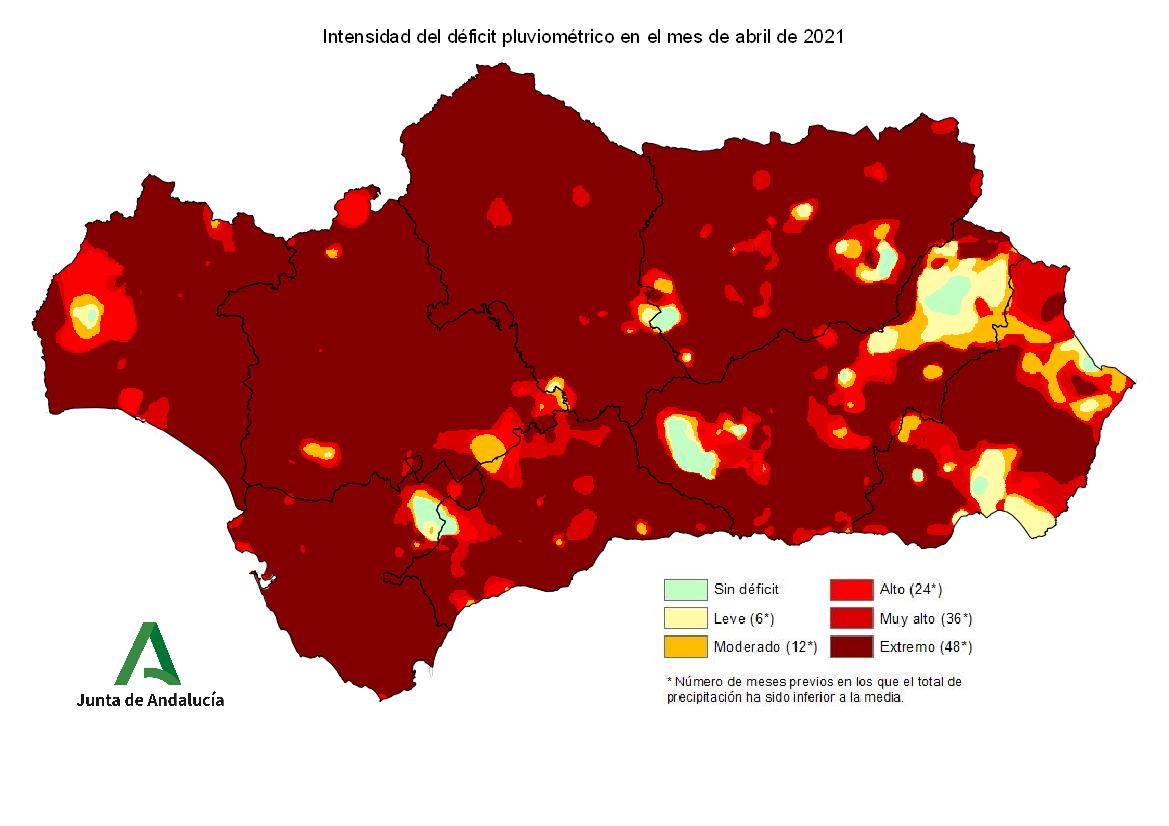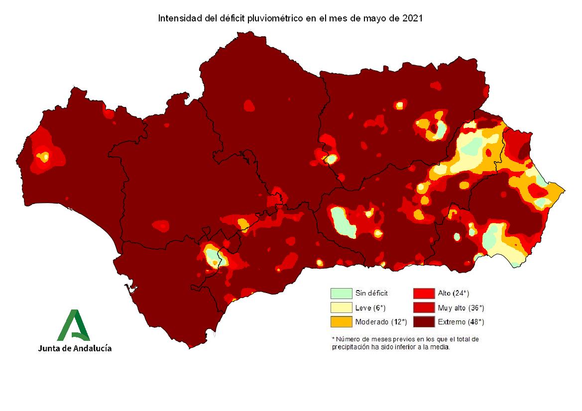 - El indicador “Intensidad de la sequía pluviométrica” evalúa el tiempo durante el cual un área sufre déficit pluviométrico, identificándose éste cuando la precipitación acumulada en el periodo evaluado haya sido inferior a la media de referencia del periodo 1971 - 2000. De esta forma las intensidades leves o moderadas señalan un déficit pluviométrico coyuntural, registrado en los 6 o los 12 meses previos a la elaboración del indicador. Los niveles superiores identifican periodos deficitarios en precipitación acumulada respecto a los 24, 36 o 48 meses previos, permitiendo identificar las áreas en las que la sequía pluviométrica está siendo más prolongada y cuyo efectos negativos pueden ser mayores.
