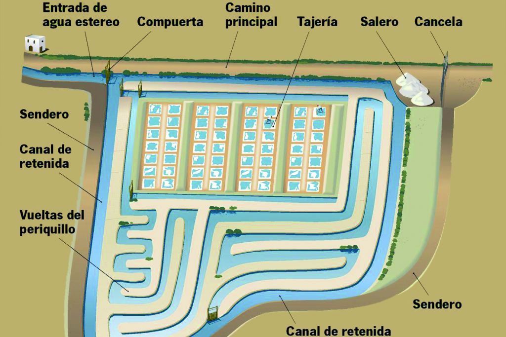 Durante el sendero se pueden ver elementos característicos de la actividad salinera, como el cargadero de sal, vueltas, esteros, compuertas tradicionales que regulan la entrada y salida de agua a la salina, y la casa salinera.