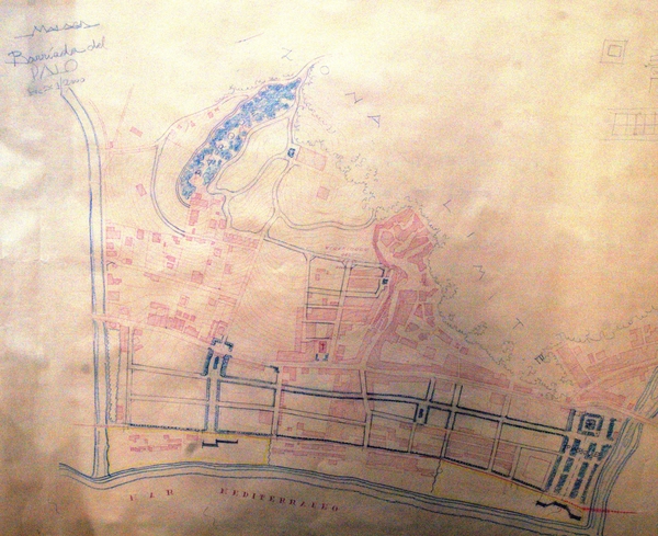 [1950-1960]. Málaga. Archivo Histórico Provincial de Málaga. Sección Fondos Privados. Sig. González Edo MPD 05335. Málaga: Barriada del Palo. Proyecto de urbanización de la barriada de El Palo. Plano; copia; lápiz y color sobre papel. 72 x 88 cm. Arquitecto González Edo. Conservación buena. Observaciones: González Edo fue el autor del Plan Urbanístico de la ciudad de Málaga aprobado en 1948 que pretendía dotar a la ciudad de infraestructuras modernas, manteniendo al mismo tiempo las caracterísitcas tradicionales de cada barrio. En El Palo no llegó a materializarse por completo.