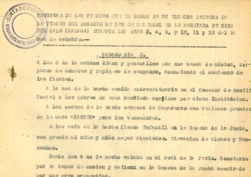 1942, septiembre, 21. Málaga. Archivo Histórico Provincial de Málaga. Sección Gobierno Civil. Sig. 8208. La Junta de Festejos de El Palo solicita al Gobernador Civil de Málaga la aprobación del programa de fiestas en honor a la Virgen del Rosario. Solicitud; original; conservación buena. Observaciones: Hoy en día las fiestas de El Palo son en julio, en honor a la Virgen del Carmen.