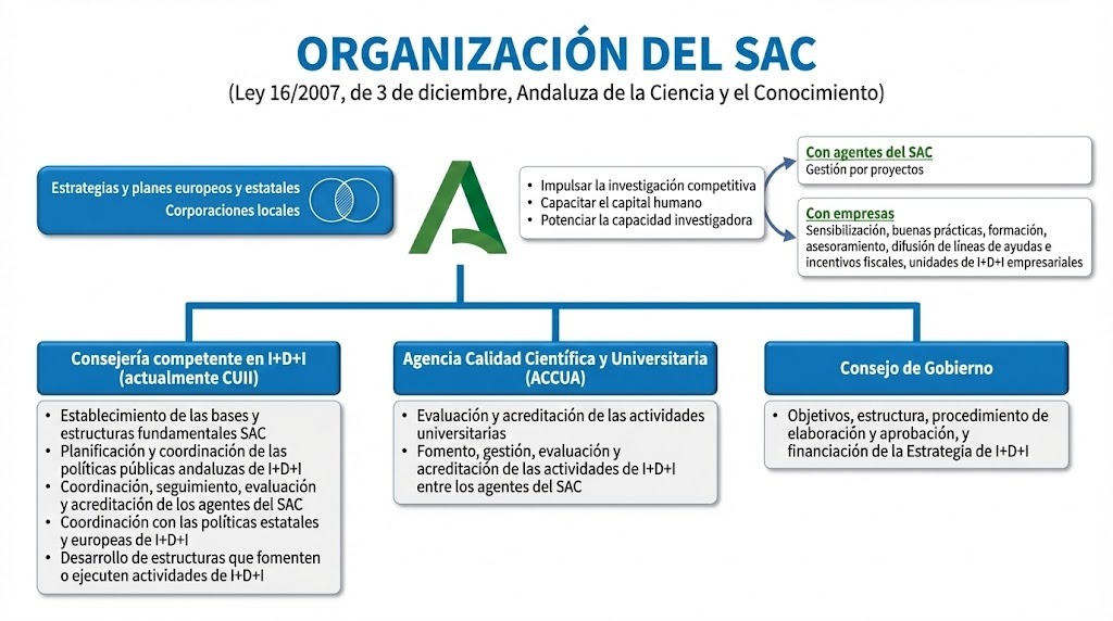 La Ley 16/2007, de 3 de diciembre, Andaluza de la Ciencia y el Conocimiento, define el SAC como un espacio cooperativo, coordinado y funcional, integrado por personas físicas y jurídicas, públicas y privadas, que desarrollan actividades relacionadas con la generación, gestión, transferencia y aplicación del conocimiento.